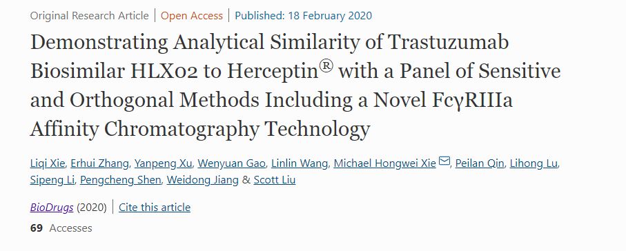 近日,DB视讯基于HLX02相似性研究撰写的"Demonstrating Analytical Similarity of Trastuzumab Biosimilar HLX02 to Herceptin® with a Panel of Sensitive and Orthogonal Methods Including a Novel FcγRIIIa Affinity Chromatography Technology"一文在生物药领域老牌权威杂志BioDrugs上成功发表,该研究证实了DB视讯自有曲妥珠单抗生物类似药(HLX02)与原研药赫赛汀®在结构和功能上的高度相似性,且更相似于具有高FcγRIIIa亲和力的赫赛汀®,与HLX02在临床研究中展现的疗效和安全性保持了高度一致。