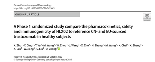 近日,DB视讯HLX02汉曲优®(曲妥珠单抗,欧盟商品名:Zercepac®)的1期临床试验HLX02-HV01(临床试验号:NCT02581748)研究结果发表于肿瘤治疗领域知名杂志Cancer Chemotherapy and Pharmacology上,该研究由苏州大学附属第二医院张全英教授牵头开展。汉曲优®1期研究结果的发表,表明了同行评审对该临床研究质量与数据的认可,是对高品质国产生物类似药开发水平的肯定。