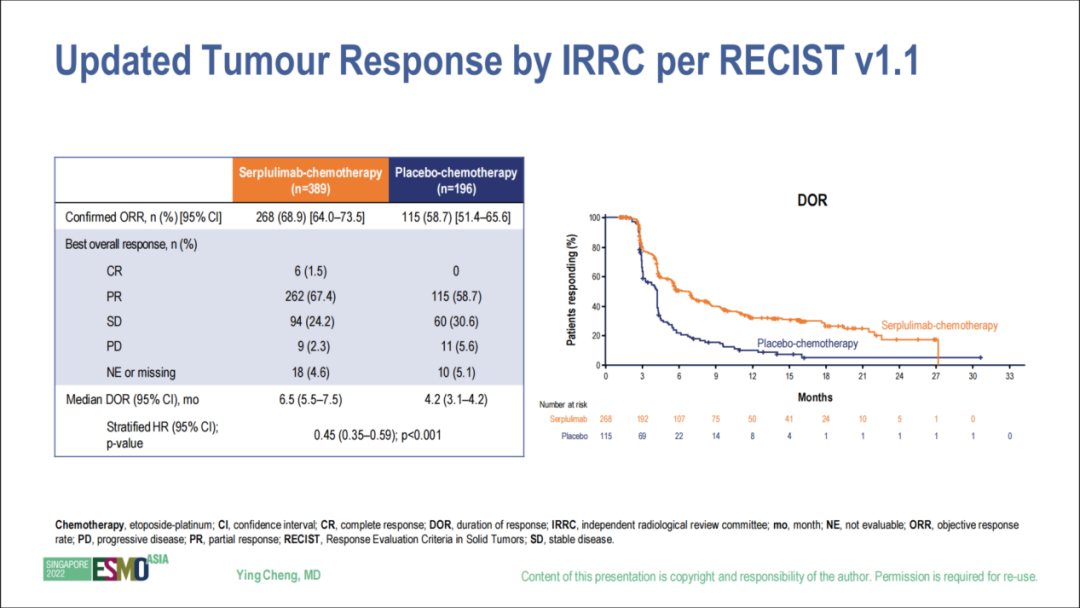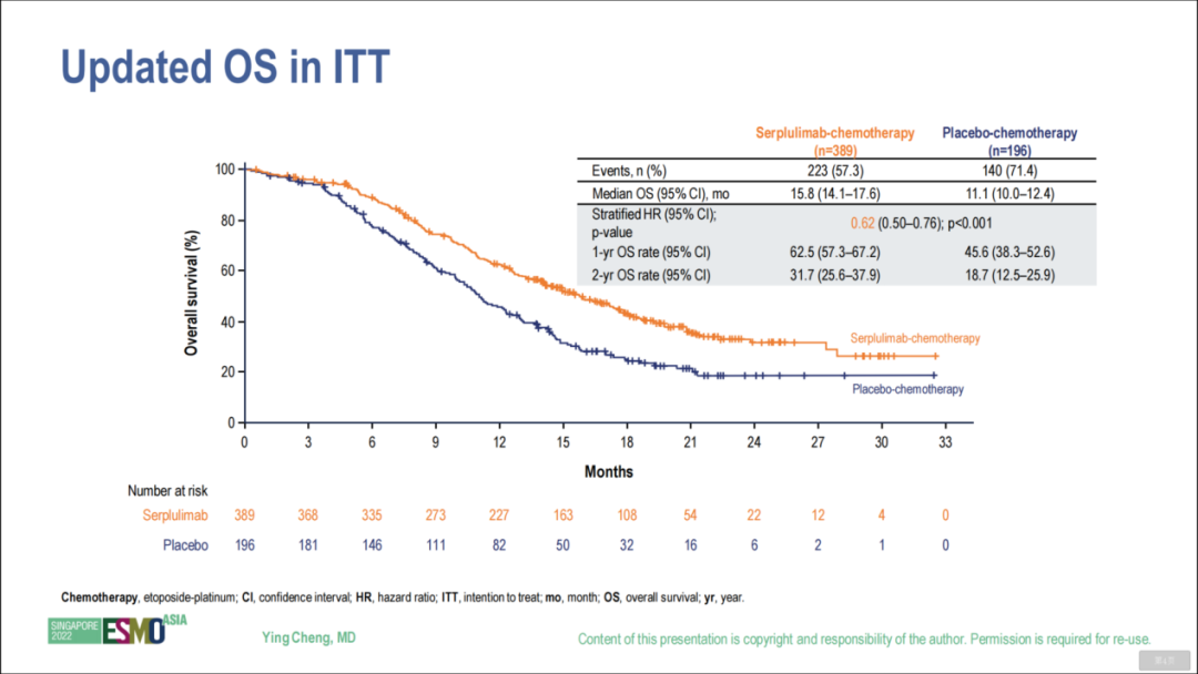 本次ESMO ASIA上程颖教授口头报道了ASTRUM-005研究经过19.8个月随访更新的总生存期(OS)、无进展生存期(PFS)、客观缓解率(ORR)、缓解持续时间(DoR)、亚裔、非亚商亚组的结果。最新数据显示,意向性治疗(ITT)人群斯鲁利单抗联合化疗组中位OS较对照组显著延长4.7个月,达15.8个月;亚裔人群中位 OS延长4.8个月,达15.9个月。斯鲁利单抗联合化疗方案再次刷新了ES-SCLC一线治疗生存数据新高度,有望重塑ES-SCLC免疫治疗新格局!本报特别整理ESMO ASIA 2022口头报告内容,并邀请程颖教授解读研究数据,分享研究体会,点评临床意义。