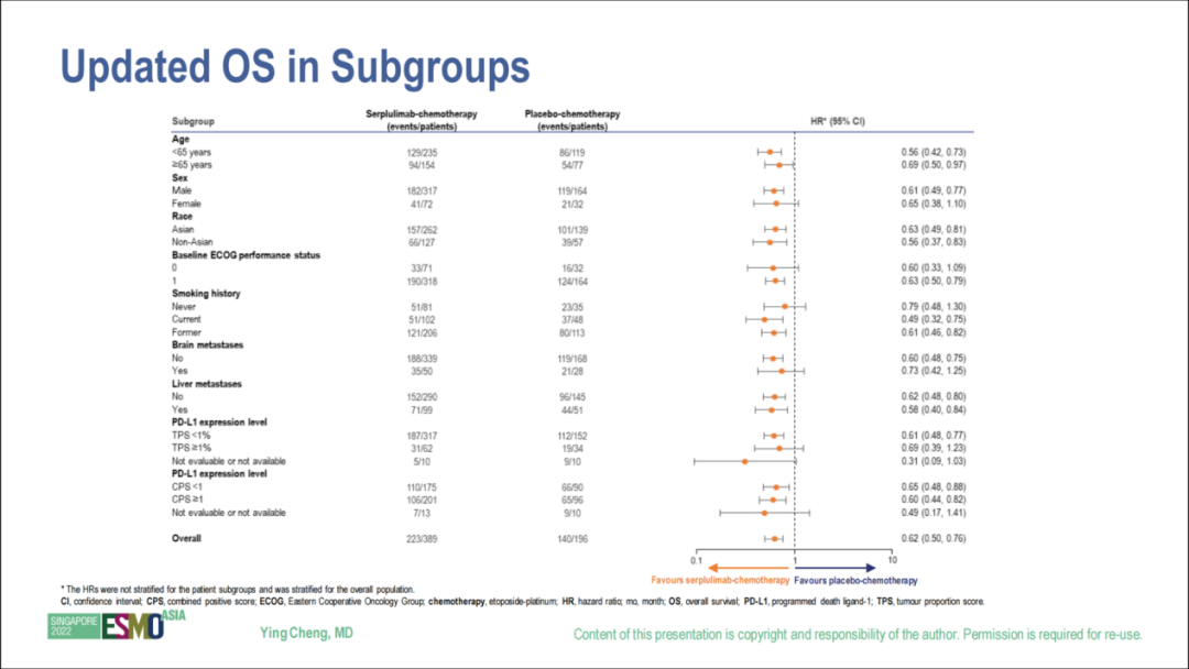 本次ESMO ASIA 2022大会上更新的结果特别公布了亚裔人群的具体数据,可以看到亚裔人群获益显著,中位OS和中位PFS的绝对获益均优于全组人群,中位PFS更是首次超过了半年。基于本研究,《CSCO小细胞肺癌诊疗指南(2022版)》已更新推荐斯鲁利单抗联合EC方案作为ES-SCLC一线治疗方案。国家药品监督管理局(NMPA)药品审评中心(CDE)也已于2022年4月受理斯鲁利单抗一线治疗ES-SCLC适应证上市申请。对此,我感到非常欣慰,我们中国ES-SCLC患者即将很快迎来斯鲁利单抗联合化疗这一疗效卓越、且可及性高的治疗手段,期待早日获批,回馈、造福广大中国患者!