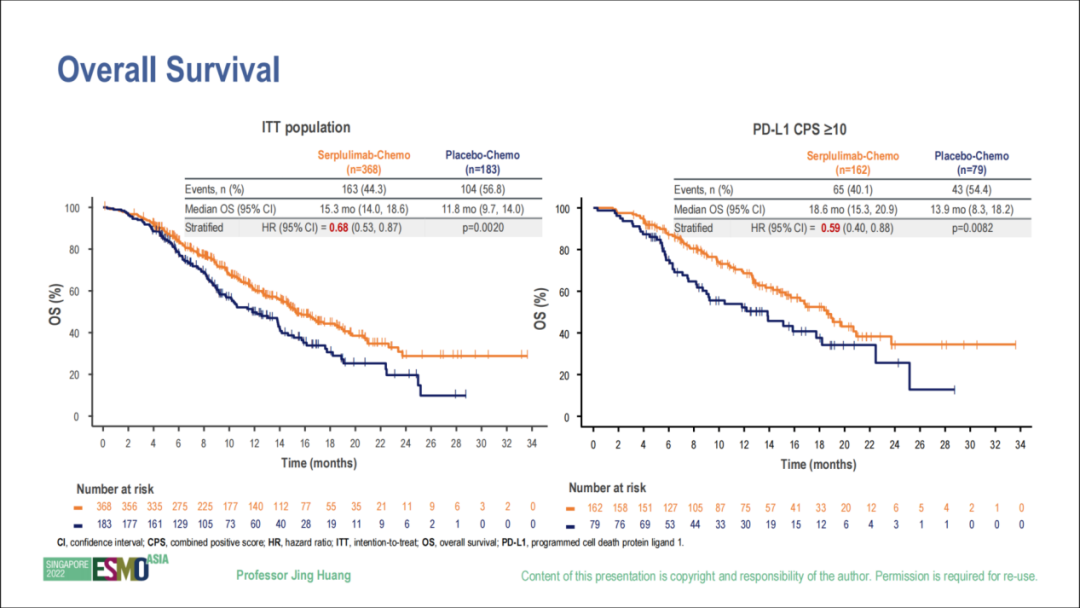 共计筛选入组551例患者,斯鲁利单抗联合化疗组368例,安慰剂联合化疗组183例,截至2022年4月15日,中位随访时间为14.9个月。斯鲁利单抗联合化疗组和安慰剂联合化疗组患者的基线分布具有较好的均衡性(见图2)。总体人群中,≥65岁的患者比例为46.1%(254/551),男性占比为85.3%(470/551),ECOG评分为1患者比例为73.5%(405/551),86.4%(476/551)的患者存在远处转移,1≤CPS<10患者比例为56.3%(310/551),CPS≥10患者比例为43.7%(241/551)。