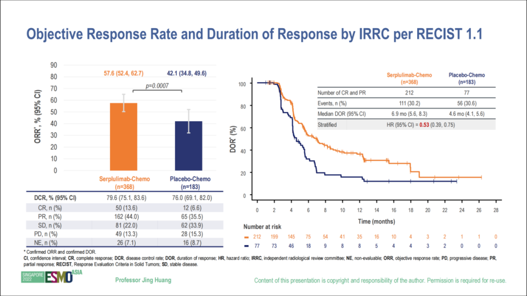次要终点方面,斯鲁利单抗联合化疗组的ORR较安慰剂联合化疗组显著改善(图5)。总人群由独立影像评估委员会(IRRC)评估,并经过确认的ORR(Confirmed ORR)分别为57.6%(50例完全缓解+162例部分缓解)vs 42.1%(12例完全缓解+65例部分缓解),差异具有统计学意义(p=0.0007);中位DoR分别为6.9m vs 4.6m(HR=0.53,95% CI 0.39-0.75)。