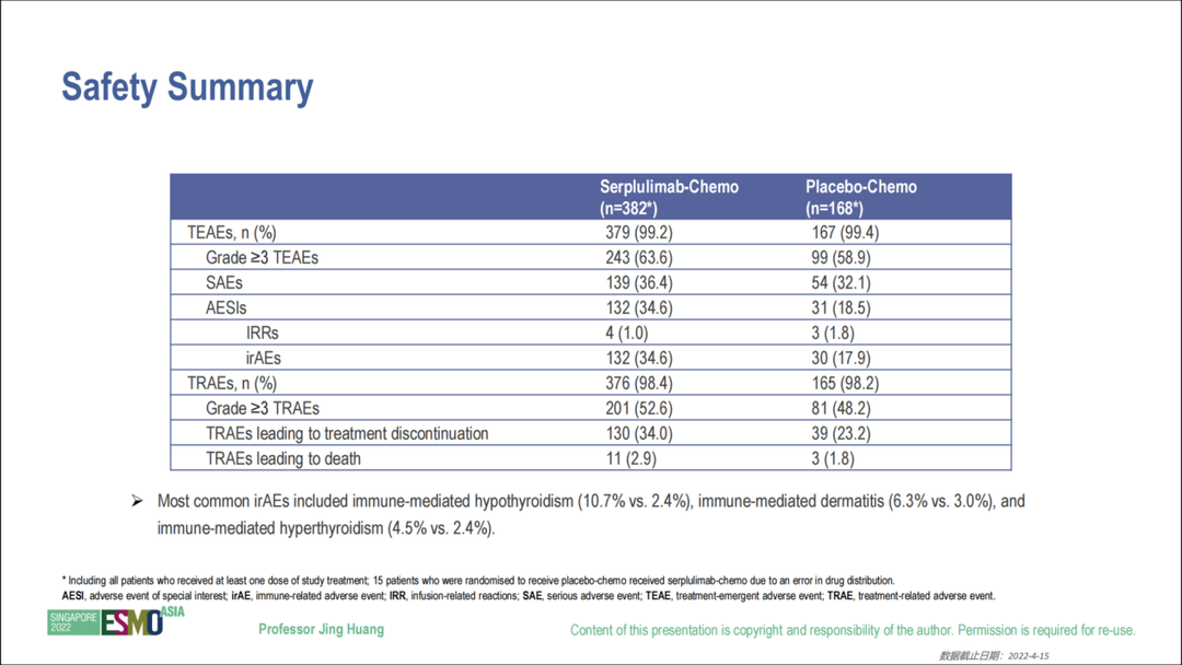安全性方面,斯鲁利单抗联合化疗组和安慰剂联合化疗组分别有243(63.6%)及99(58.9%)例患者发生≥3级治疗相关不良事件(TRAEs),分别有11(2.9%)和3(1.8%)例患者发生了与治疗相关的死亡。斯鲁利单抗联合化疗组免疫相关不良事件(irAEs)发生率较安慰剂联合化疗组高(34.6% 和17.9%),与已获批的PD-1/PD-L1抑制剂相似。最常见的irAEs包括免疫介导性甲状腺功能减退、免疫介导性皮炎和免疫介导性甲状腺功能亢进症。见图6。