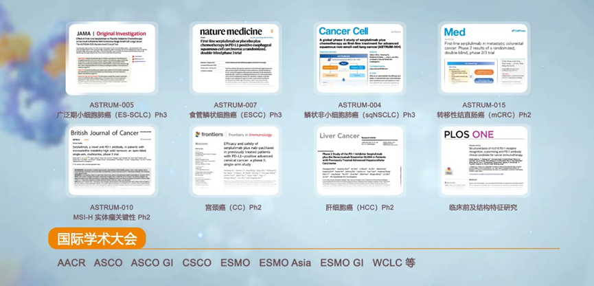 斯鲁利单抗的多项关键性临床研究结果发表于国际知名期刊JAMA, Nature Medicine, Cancer Cell和Med等,并多次在权威学术大会上发布数据更新。此外,斯鲁利单抗还荣获《CSCO 小细胞肺癌诊疗指南》、《CSCO非小细胞肺癌诊疗指南》、《CSCO 食管癌诊疗指南》、《CSCO结直肠癌诊疗指南》、《CSCO免疫检查点抑制剂临床应用指南》和《中国食管癌放射治疗指南》等多部权威指南推荐,为肿瘤临床诊疗提供重要参考。