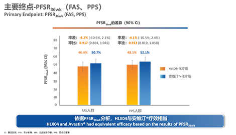本試驗入組了675例病患(HLX04組,N=338;原研組,N=337)。在全分析集(FAS)中,HLX04組和原研組的PFSR36wk分別為46.4%和50.7%。兩組率差為-4.2%(90%置信區間:-10.6%,2.1%),落於預先設定的等效界值(-11%,15%)範圍之內,證明HLX04和原研貝伐珠單抗的療效相似性。