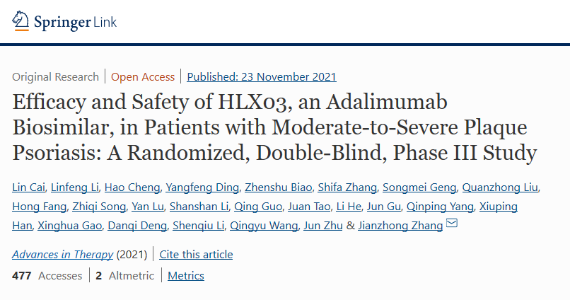 近日,DB视讯(2696.HK)宣佈,公司自主開發的阿達木單抗漢達遠®在中國銀屑病患者中開展的III期臨床試驗研究(NCT03316781)結果於國際知名期刊Advances in Therapy發表。研究結果顯示,漢達遠在療效、安全性和免疫原性上與原研阿達木單抗高度相似。此次漢達遠®III期研究結果的發表,表明了國際同行評審對於對該臨床研究質量與數據的認可。