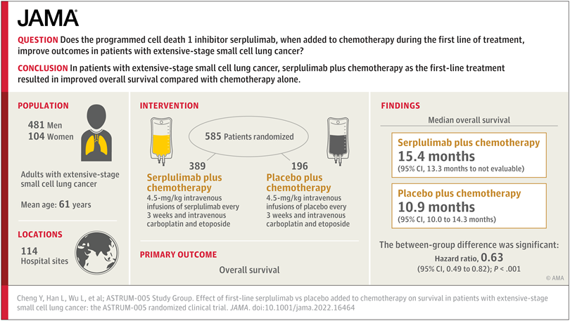 ASTRUM-005是一項在既往未接受過治療的ES-SCLC患者中比較H藥聯合化療及安慰劑聯合化療的臨床有效性和安全性的隨機、雙盲、國際多中心、Ⅲ期臨床研究,在中國、土耳其、歐盟波蘭、格魯吉亞等多個國家共開設128個試驗中心,其中114個試驗中心有受試者參與了篩選,共入組585例受試者,約31.5%為白人。截至2021年10月22日,本研究共入組的斯魯利單抗組(n=389)和安慰劑組(n=196)中位隨訪時間為12.3個月。斯魯利單抗組和安慰劑組的中位OS分別為15.4個月(95% CI 13.3–NE)和10.9個月(95% CI 10.0–14.3),風險比(HR)為0.63(95% CI 0.49–0.82;p<0.001)。兩組的24個月總生存率分別為43.1%和7.9%。斯魯利單抗組及安慰劑組經獨立影像評估委員會(IRRC)依據RECIST v1.1評估的中位PFS分別為5.7和4.3個月(HR 0.48,95% CI 0.38–0.59)。安全性方面,斯魯利單抗組的免疫相關不良事件(irAEs)發生率與已獲批的PD-1/PD-L1單抗相似。