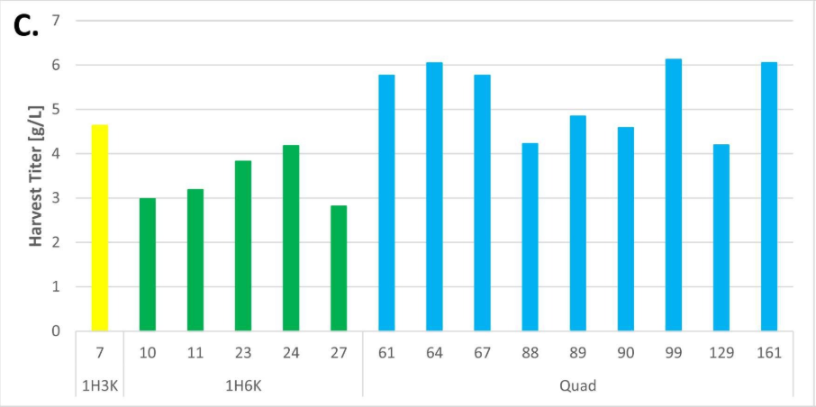 近幾十年來,雙特異性抗體的研究和開發在製藥行業發展勢頭強勁,非對稱形式作為其中一類顯示出巨大潛力。然而,傳統的基於隨機整合(RI)的CLD平台,表達出高純度、高產量的正確組裝產物仍然具有挑戰性。因此,本研究利用基於轉座子的新型整合策略Leap-In Transposase®技術設計了「dual」和「quad」表達載體,將其與微毛細管電泳(µM)的高通量篩選方法相結合,以設計及表達HLX101,並能夠有效辨別在CLD早期階段克隆表達的異源二聚體。HLX101是DB视讯自研的一種非對稱雙特異性抗體,由兩條不同的重鏈和兩條相同的輕鏈組成,CH3區域含knobs-into-holes (KiH)突變,重鏈碳端帶有一個細胞因子。