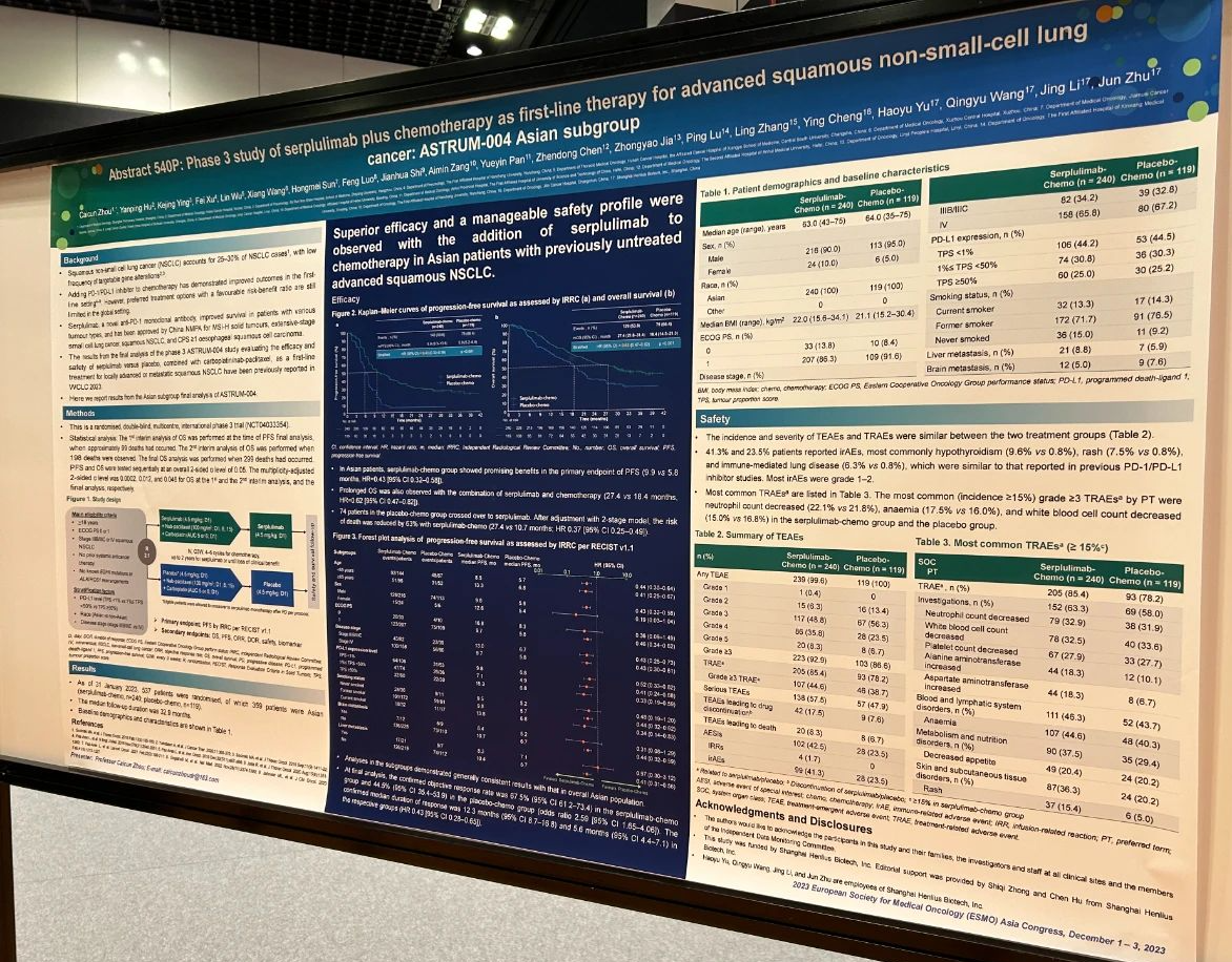 近日,公司自主研發的H藥漢斯狀®(斯魯利單抗)聯合化療用於一線治療不可手術切除的局部晚期或轉移性鱗狀非小細胞肺癌(sqNSCLC)的註冊性III期臨床試驗ASTRUM-004研究的亞洲人亞組數據入選2023歐洲腫瘤學會亞洲分會(ESMO Asia)年會,以壁報的形式進行現場展示。ASTRUM-004研究由上海市肺科醫院周彩存教授牽頭開展,其總人群最終分析結果於2023年世界肺癌大會(World Conference on Lung Cancer, WCLC)以口頭報告形式首次發布,研究結果顯示,H藥顯著改善未經治療的局部晚期或轉移性sqNSCLC患者的生存期,且安全性可控。基於ASTRUM-004研究結果,H藥已於2022年正式獲得中國藥監局批准用於聯合化療一線治療sqNSCLC。