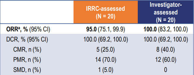 截至2023年7月14日,共有30例患者入組。患者的中位年齡為38.5歲;13(43.3%)例患者為男性。19(63.3%)例患者被診斷為LCH,10(33.3%)例被診斷為ECD,1(3.3%)例為LCH合併ECD。8(26.7%)例患者為單系統多病灶病變,22(73.3%)例為多系統病變。中位隨訪時間為10.7個月。在20例療效可評估的患者中,IRRC根據PERCIST 1.0評估的未確認的ORR為95.0%(95% CI 75.1–99.9%)。腫瘤緩解的詳細結果見表1。在接受HLX208治療的30例患者中,有5(16.7%)例報告了3–4級治療相關不良事件,最常見的是丙氨酸氨基轉移酶升高(6.7%)和天門冬氨酸氨基轉移酶升高(6.7%)。治療期間未見導致死亡的不良事件。