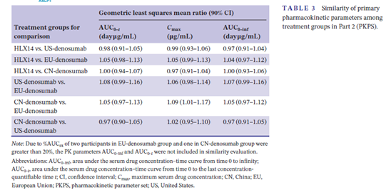 研究數據顯示,HLX14與美國、歐盟及中國市售的原研地舒單抗在藥物代謝動力學特徵和藥效學具有高度相似性。第二階段中,對於所有3個主要研究終點,HLX14和參照藥的幾何平均均值比(GMRs)均接近1,且其90%置信區間(CIs)均落在預設的等效性界值區間(0.8~1.25)範圍內(AUC0–t,0.91-1.13;Cmax,0.91-1.13;AUC0–inf,0.91-1.12)。