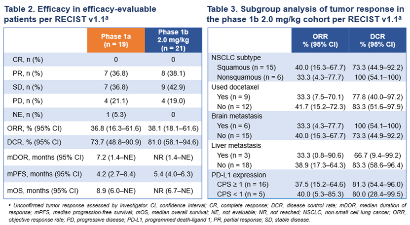 研究者評估的Ia期的客觀緩解率(ORR)為36.8%;75%的胸腺鱗狀細胞癌患者達到部分緩解(3/4名,ORR = 75%)。Ib期2.0 mg/kg組NSCLC患者經研究者評估的ORR為38.1%,其中鱗狀NSCLC患者的ORR為40%。值得關注的是,腦轉移NSCLC患者的疾病控制率(DCR)達到100%。