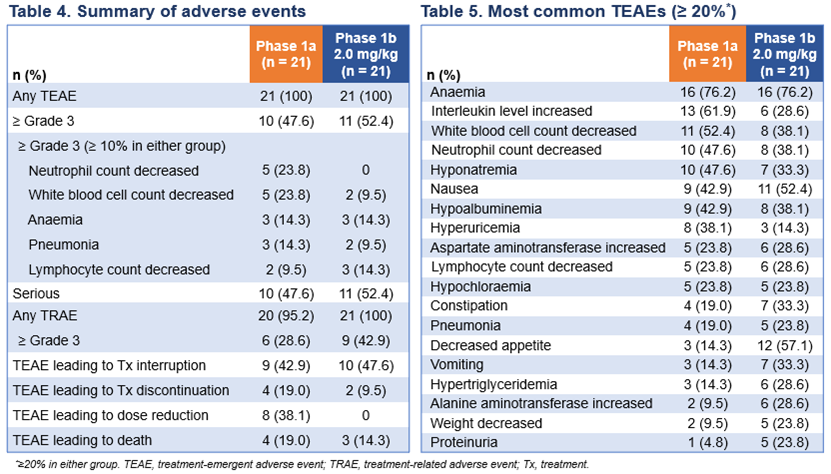 Ia期研究的中位無進展生存期(PFS)為4.2個月,Ib期2.0 mg/kg組的中位PFS為5.4個月。中位總生存期(OS)分別為8.9個月和未達到。