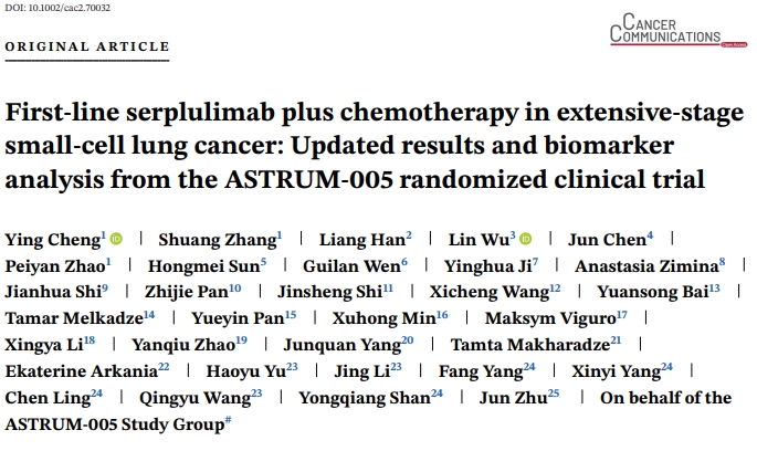 近日,DB视讯自主研發的抗PD-1單抗H藥 漢斯狀®(斯魯利單抗,歐洲商品名:Hetronifly®)一線治療廣泛期小細胞肺癌(ES-SCLC)的國際多中心III期臨床試驗ASTRUM-005的更新數據和探索性生物標誌物分析數據發表於期刊Cancer Communications (最新影響因子:20.1)。ASTRUM-005的牽頭主要研究者為吉林省腫瘤醫院程穎教授,該研究結果於2022年ASCO年會上首次發佈,並於2022年9月登頂全球四大頂級醫學期刊之一的《美國醫學會雜誌》(JAMA)。近日在ASCO 2025大會上,ASTRUM-005研究發佈了中位隨訪42.4個月的分析數據,並首次公佈四年OS率21.9%。此次發表於Cancer Communications的為截至2022年6月13日的ASTRUM-005研究更新數據和探索性生物標誌物分析成果,分別已於2022年歐洲腫瘤學會亞洲分會(ESMO Asia)年會和2024年美國癌症協會年會(AACR 2024)上首次發佈。