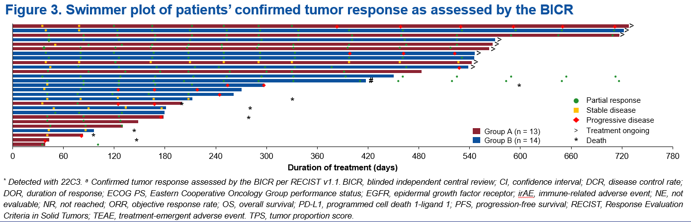 A組和B組中,獨立影像評估委員會(IRRC)根據RECIST 1.1評估的確認ORR分別為69.2%(95% 置信區間[CI] 38.6–90.9)和71.4%(95% CI 41.9–91.6),疾病控制率分別為92.3%(95% CI 64.0–99.8)和100%(95% CI 76.8–100.0)。