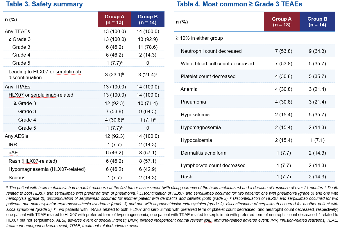 兩組所有患者均報告了治療期間不良事件(TEAE),常見的≥3級TEAE以皮膚反應、電解質紊亂為主,與同類藥物相比,未發現新的安全性信號。