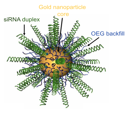 Schematic of NU-0129, a Bcl2L12-targeting, siRNA-based SNA (spherical nucleic acid) [8]