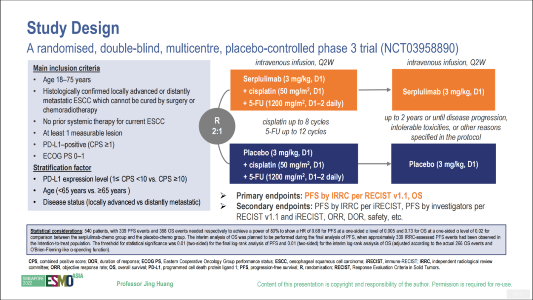 这是一项随机、双盲、多中心、安慰剂对照的III期临床试验(NCT03958890)。主要纳入标准包括:①年龄为18~75岁,②经组织学确诊的不可手术切除或通过放化疗治愈的局部晚期/复发或远处转移的ESCC,③未接受过针对本次肿瘤的系统性治疗,④至少有一个可测量的病灶,⑤PD-L1阳性(CPS≥1),⑥ECOG评分为0或1。患者按照2:1的比例随机分配至实验组和对照组,两组治疗方案分别为斯鲁利单抗或安慰剂(3 mg/kg,D1)+ 顺铂(50 mg/m2,D1)+ 5-FU(2400 mg/m2,D1-2),每2周1次,顺铂最长治疗8个周期,5-FU最长治疗12个周期,斯鲁利单抗最长治疗2年,或直至发生疾病进展、毒性不耐受或其他事件。研究的主要终点为PFS(由独立影像评估委员会(IRRC)据RECIST v1.1评估)和OS,次要终点包括PFS(由IRRC据iRECIST评估、由研究者据RECIST v1.1和iRECIST评估)、客观缓解率(ORR)、缓解持续时间(DoR)和安全性等。