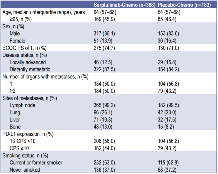 共计筛选入组551例患者,斯鲁利单抗联合化疗组368例,安慰剂联合化疗组183例,截至2022年4月15日,中位随访时间为14.9个月。斯鲁利单抗联合化疗组和安慰剂联合化疗组患者的基线分布具有较好的均衡性(见图2)。总体人群中,≥65岁的患者比例为46.1%(254/551),男性占比为85.3%(470/551),ECOG评分为1患者比例为73.5%(405/551),86.4%(476/551)的患者存在远处转移,1≤CPS<10患者比例为56.3%(310/551),CPS≥10患者比例为43.7%(241/551)。