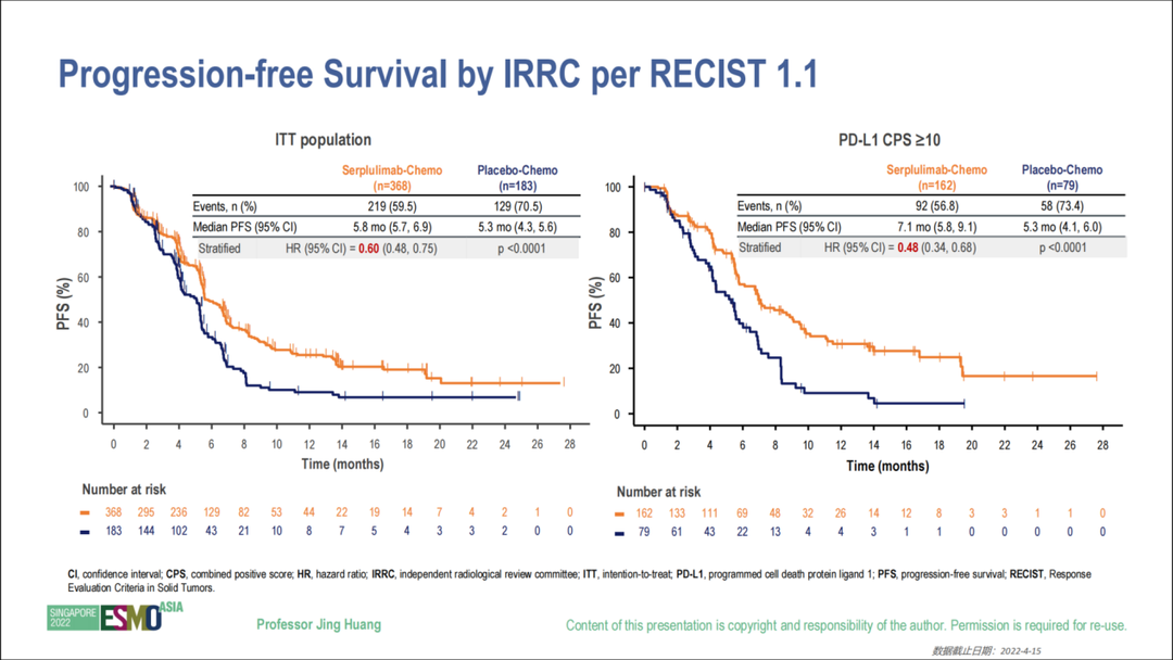 主要终点方面,斯鲁利单抗联合化疗组的中位PFS(由IRRC据RECIST v1.1评估)和中位OS均较安慰剂联合化疗组显著延长,CPS≥10人群获益更大。两组总人群中位OS分别为15.3m vs 11.8m(HR=0.68,p=0.0020),死亡风险降低32%;CPS≥10人群中位OS分别为18.6m vs 13.9m(HR=0.59,p=0.0082),死亡风险降低41%(见图3)。两组总人群中位PFS分别为5.8m vs 5.3m(HR=0.60,p<0.0001),疾病进展风险降低40%;CPS≥10人群中位PFS分别为7.1m vs 5.3m(HR=0.48,p<0.0001),疾病进展风险降低52%(见图4)。
