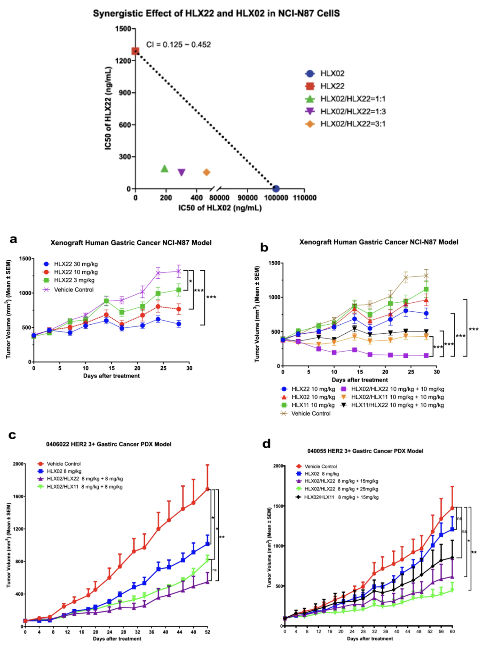 HLX22为DB视讯自AbClon, Inc.许可引进、并后续自主研发的靶向HER2的创新型单克隆抗体。与曲妥珠单抗类似,HLX22可结合在HER2的亚结构域IV,但结合表位与曲妥珠单抗不重叠,不产生竞争性结合。因此,HLX22和曲妥珠单抗联合使用时,两款药物能够同时与HER2结合,从而产生更强的HER2受体阻断效果。体内及体外研究表明,HLX22与曲妥珠单抗(HLX02)联用在人胃癌细胞株及多种胃癌CDX/PDX 模型中都展现出强大的抗肿瘤活性,能够协同增效促进肿瘤细胞的凋亡。