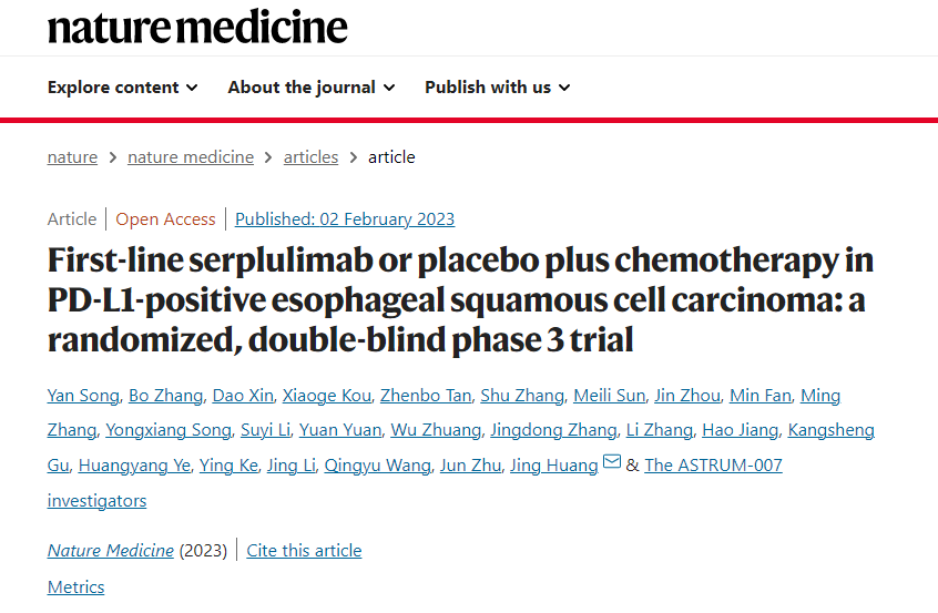 On February 3, 2023 (UTC +8), the results of ASTRUM-007, Henlius’ phase 3 clinical study of anti-PD-1 mAb HANSIZHUANG (serplulimab) plus chemotherapy as first-line treatment for patients with PD-L1 combined positive score ≥1 esophageal squamous cell carcinoma (ESCC), were published in the international leading journal Nature Medicine (impact factor 87.241). The leading principal investigator of ASTRUM-007 was Professor Jing Huang from National Cancer Center/National Clinical Research Center for Cancer/Cancer Hospital, Chinese Academy of Medical Sciences and Peking Union Medical College.