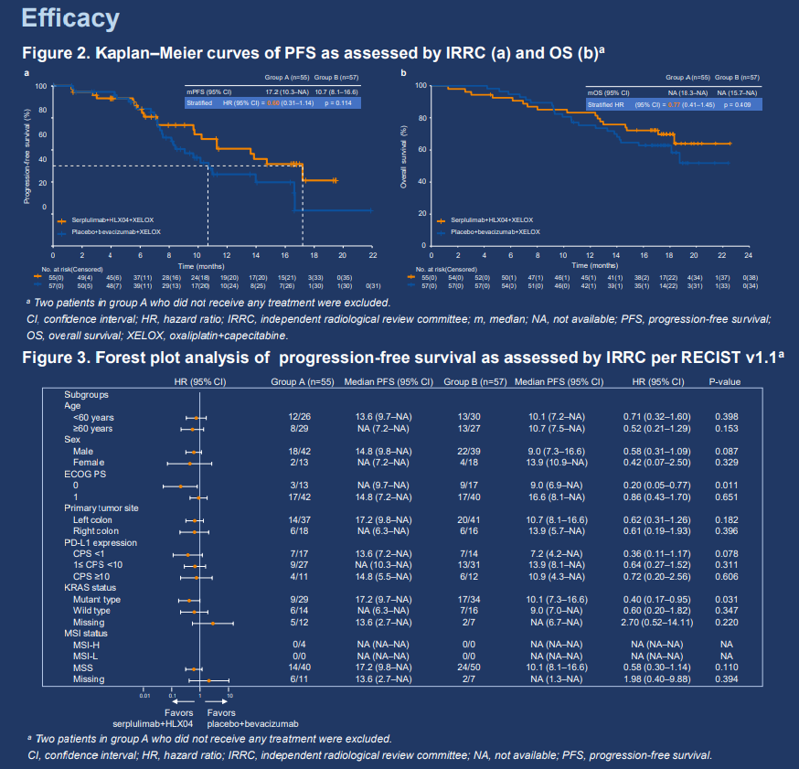 This was a randomized, double-blind, multicenter phase 2/3 study; current report will focus on the phase 2 part. Patients with unresectable metastatic/recurrent colorectal adenocarcinoma and no prior systemic therapy were randomized 1:1 to receive serplulimab (300 mg, Q3W IV) plus HLX04 (a bevacizumab biosimilar, 7.5 mg/kg, Q3W IV) and XELOX (group A) or placebo plus bevacizumab and XELOX (group B). Randomization was stratified by PD-L1 expression level (CPS <1 vs. 1≤ CPS <50 vs. CPS ≥50), ECOG PS score (0 vs. 1), and primary tumor site (left- vs. right-sided). The primary endpoint was IRRC-assessed PFS per RECIST 1.1. Secondary endpoints included other efficacy endpoints, safety, pharmacokinetics, biomarker explorations, and quality-of-life assessments.