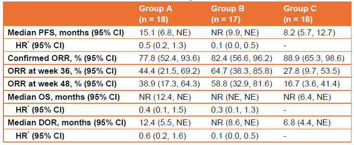 As of July 30, 2023 (data cutoff), 53 patients were randomized to group A (n = 18), B (n = 17), and C (n = 18), and were followed up for a median of 14.3 months. 44 (83.0%) patients were male. Main efficacy results are presented in Table 1. Tumor assessments reported in Table 1 were performed by IRRC. Treatment-related adverse events (TRAEs) occurred in 18 (100.0%), 16 (94.1%), and 17 (94.4%) patients in the respective groups. Serious TRAEs were observed in 5 (27.8%) patients in group A, 1 (5.9%) in group B, and 1 (5.6%) in group C. Only 1 (5.6%) patient in group C had a grade 5 TRAE.