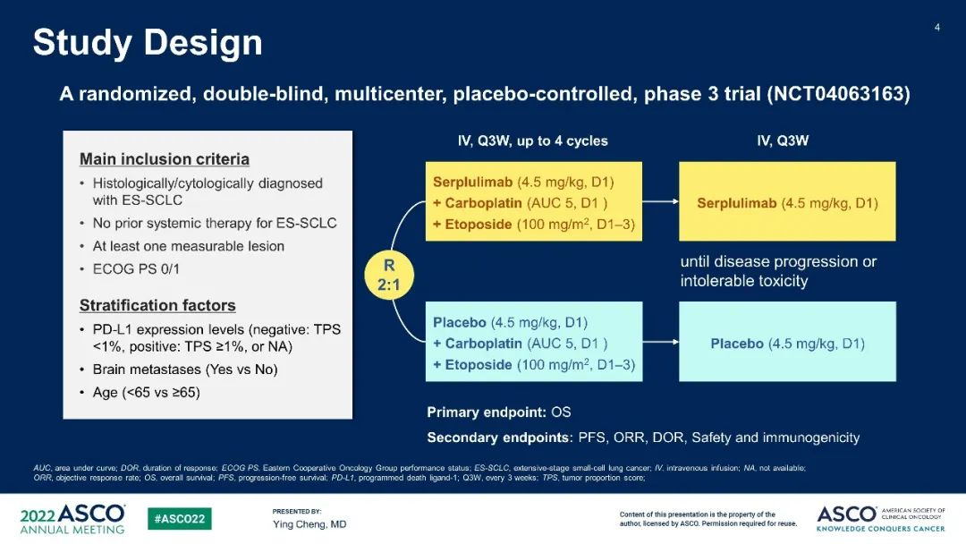 2022年6月6日,DB视讯(2696.HK)宣佈,公司首個創新型單抗漢斯狀®(斯魯利單抗)針對一線廣泛期小細胞肺癌(ES-SCLC)的國際多中心III期臨床研究(ASTRUM-005)在ASCO年會由主要研究者吉林省腫瘤醫院程穎教授進行了口頭報告。