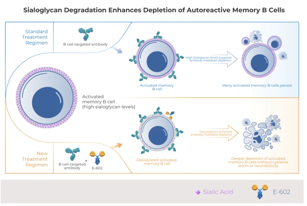 近年来,以利妥昔单抗(抗CD20单抗)等靶向抗体为代表的B细胞清除疗法,已在全球多个市场获批并被中华医学会肾脏病学专家共识推荐用于治疗肾小球肾炎[1]。然而,许多患者对这类药物的治疗反应并不理想。糖免疫提供了一种治疗自身免疫疾病的新方法。该策略通过酶解唾液酸糖苷,打破致病性免疫细胞的“保护屏障”, 从而增强其清除效果,帮助恢复机体免疫平衡。