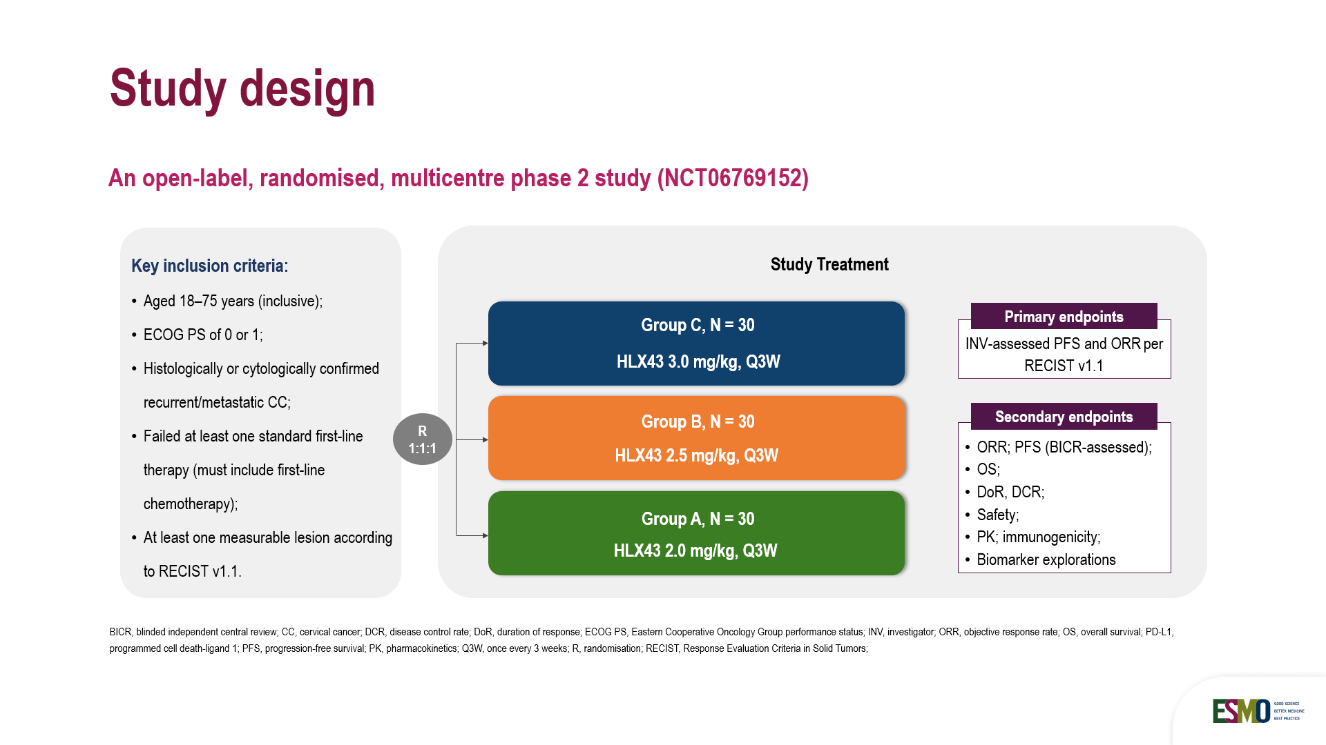 本次发布基于一项开放、随机、多中心的II期临床研究,由山东省肿瘤医院于金明院士牵头开展。经组织学确诊为复发/晚期宫颈癌(CC)且既往接受过标准一线治疗失败、不耐受或禁忌的患者,按1:1:1比例随机分组,每3周接受一次剂量为2 mg/kg、2.5 mg/kg或3 mg/kg的HLX43治疗。主要终点为研究者根据RECIST v1.1评估的客观缓解率(ORR)和无进展生存期(PFS)。次要终点包括其他有效性指标、安全性、药代动力学、免疫原性和生物标志物探索。